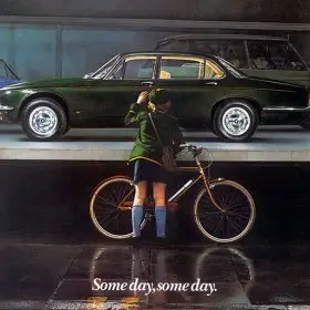 Do you remember the lovely Jaguar XJ advertisement published in the early 1970s? It showed a school boy standing in front of a Jaguar dealer’s shop window adoring the green XJ inside. The boy was saying “someday, someday”? Obviously they sketched me in to the story even though I wasn’t born at the time! What foresight?